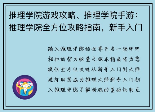 推理学院游戏攻略、推理学院手游:推理学院全方位攻略指南,新手入门到大师进阶